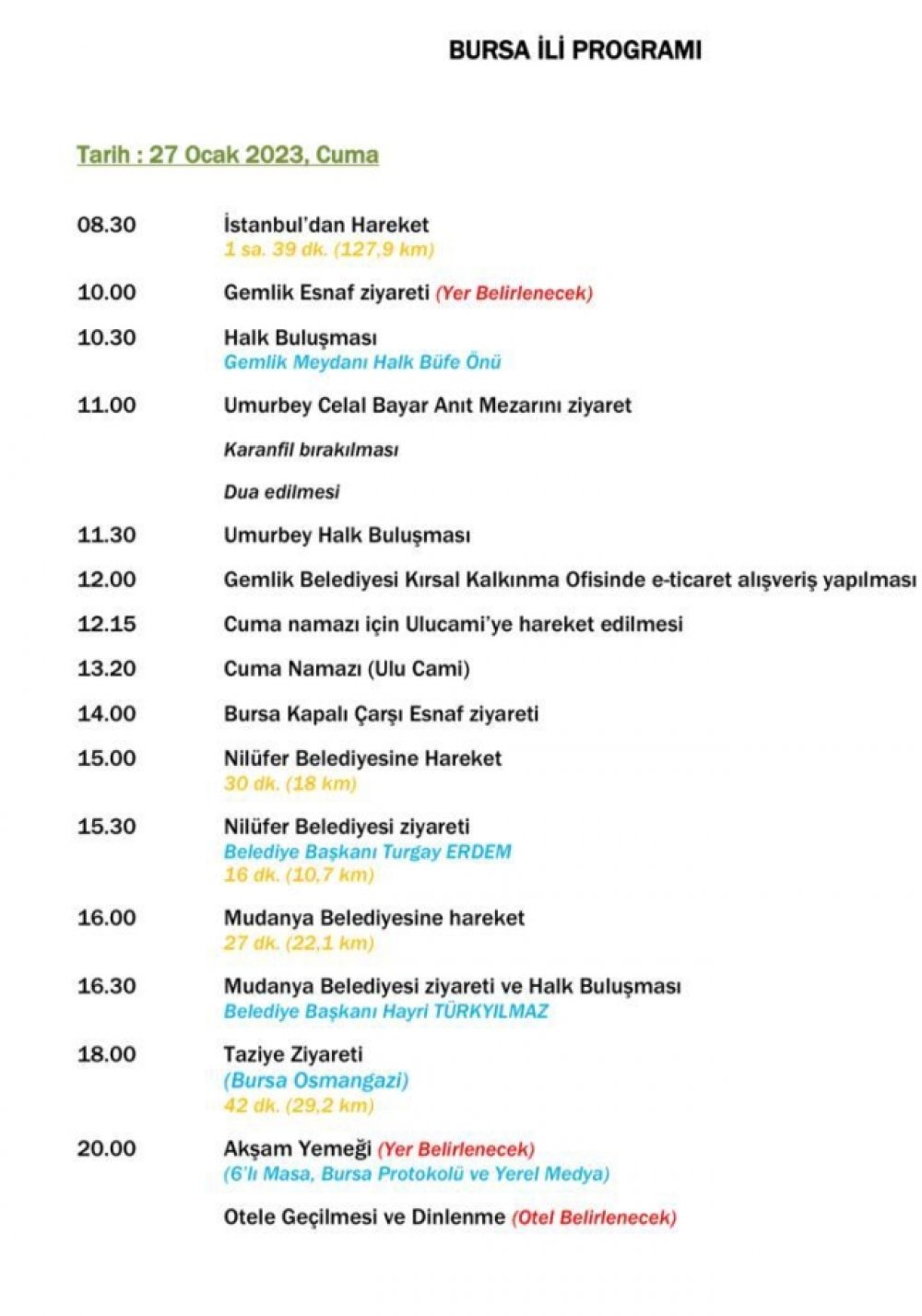 “İstanbul Büyükşehir Belediye Başkanımız Ekrem İmamoğlu Anadolu turuna çıktı. Süreç içerisinde 15’ten fazla ili ziyaret edecek olan İmamoğlu'nun 27 Ocak 2023 Cuma günkü durağı Bursa olacak. Başkan İmamoğlu'nun Bursa programı için hazırlıklar devam ederken, taslak program şu şekildedir. Bilginize sunarız.